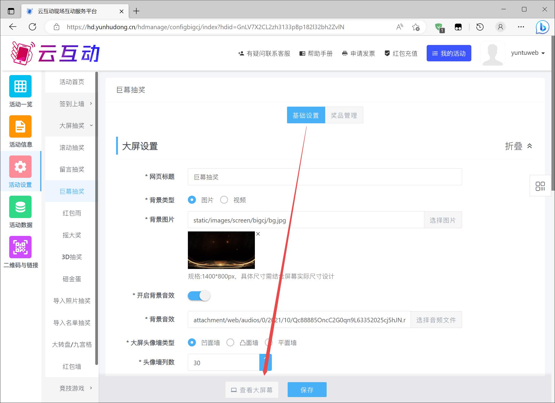 2、在活动设置中的大屏幕抽奖菜单中找到巨幕抽奖,即可进入巨幕抽奖的基础设置。在基础设置中可以对抽奖大屏幕的背景、图片、音效、和头像的显示数量以及抽奖人数显示效果等进行个性化设置,如无特殊需求,使用默认设置即可。