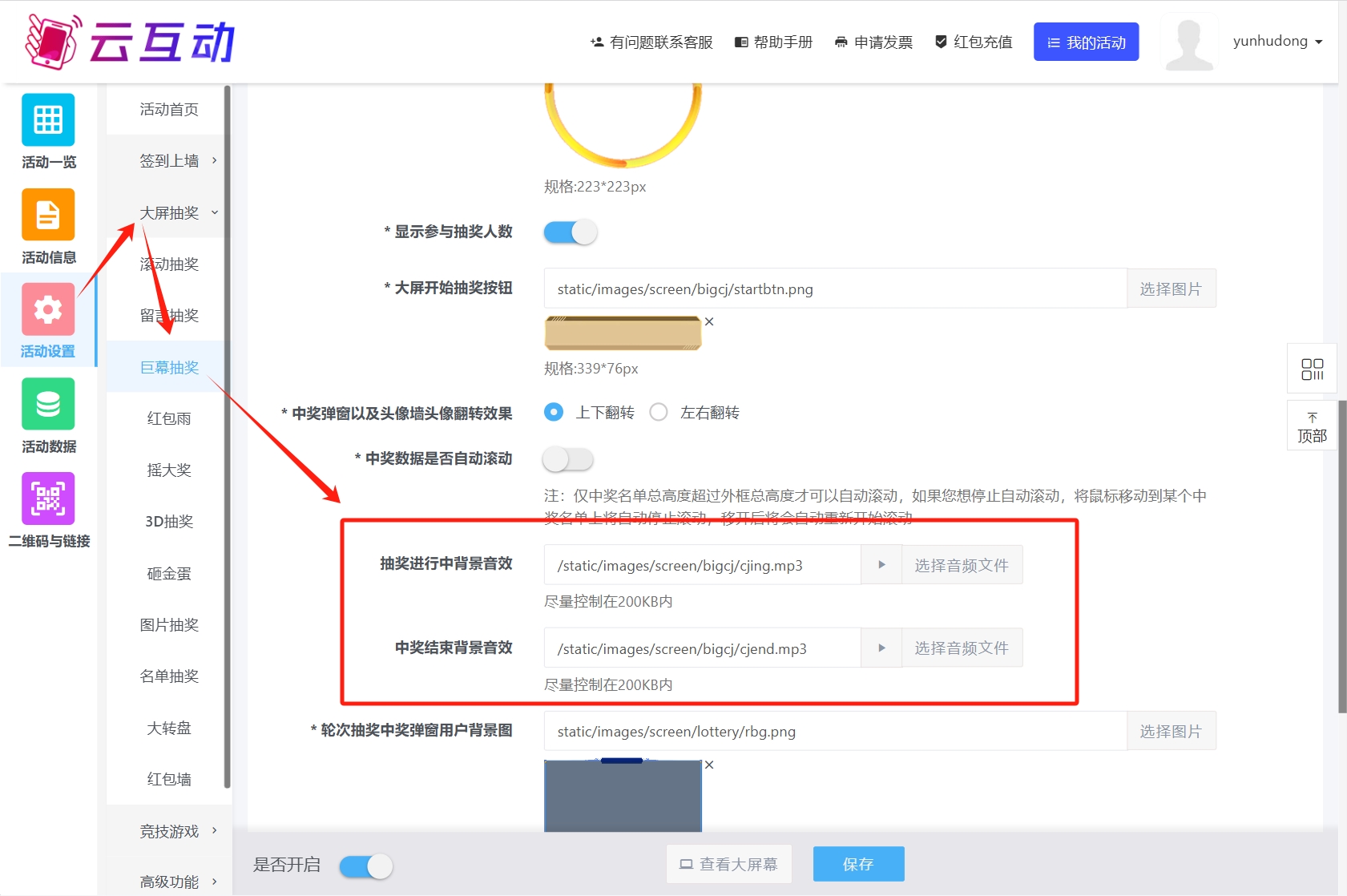 在此基础上云互动系统最新版本中加入了“抽奖进行中背景音效”、“中奖结束背景音效”两个选项的自定义设置功能,可以在活动设置大屏抽奖功能中的巨幕抽奖的基础设置中进行自定义修改,从而可以满足更多客户的抽奖需求。