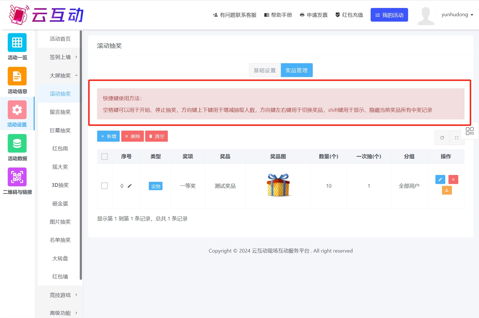 在最新版本的云互动系统中,所有的抽奖功能的奖品管理页面顶部均增加了抽奖功能快捷键的使用方法: