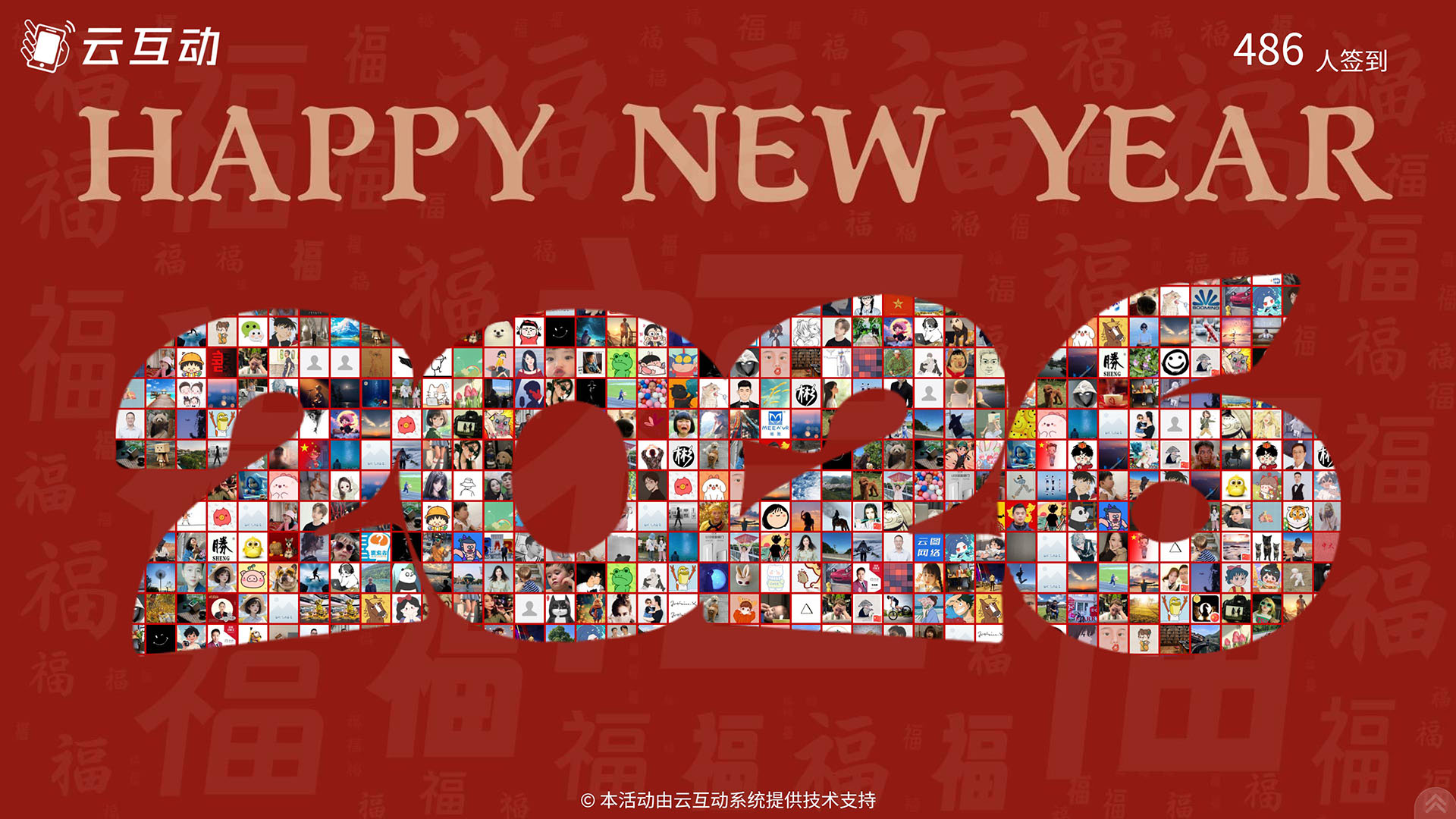 此次云互动系统推出的新年剪影马赛克签到新主题,背景为红色衬托各种字体的福字组成,并映有“happy new year”的口号,新年的喜庆气氛一目了然,由签到用户头像组成2026字体剪影,寓意携手一起迈入新一年,非常适合在马年年会上使用。
