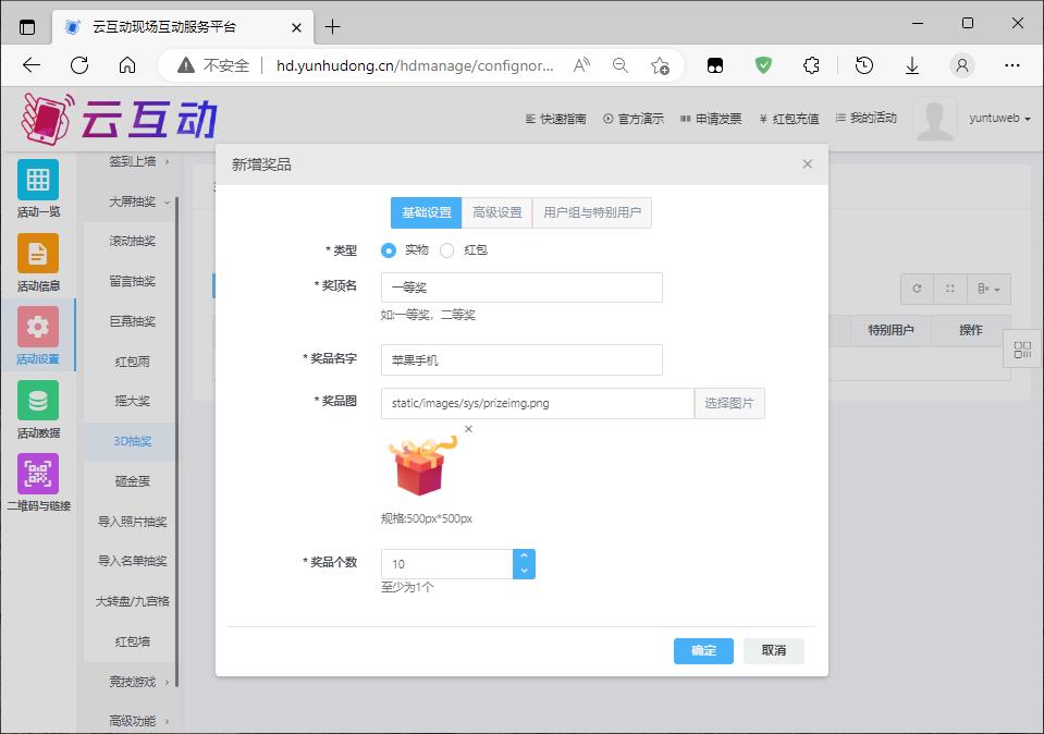 4、在新增奖品中可以设置奖品名称、奖品登记、奖品图片和数量,然后点击确定保存即可