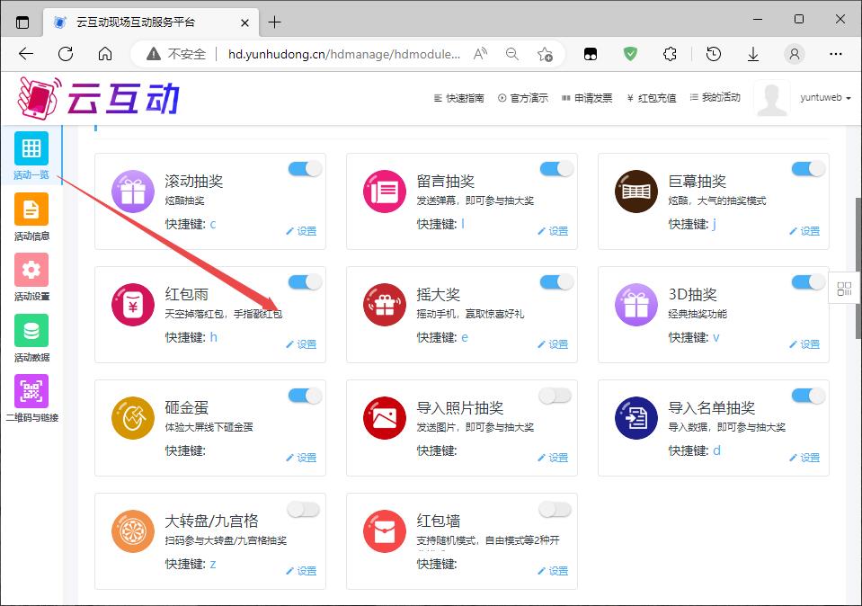 1、创建一个新活动后在活动设置中的活动一览中找到红包雨,点击设置。