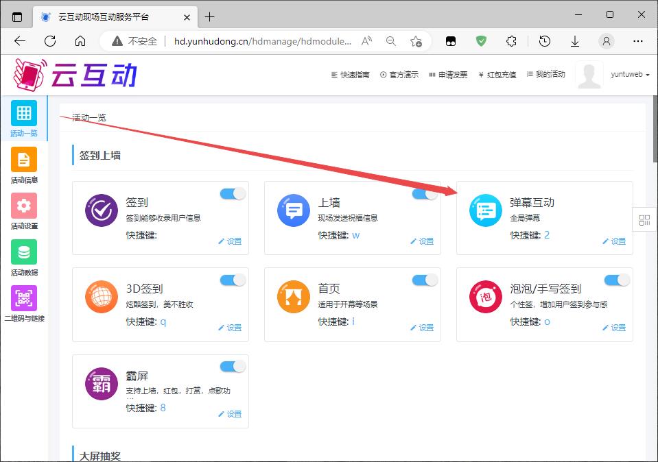 3、也可以在活动设置中的签到上墙功能合集中找到弹幕互动,在弹幕互动的设置页面,可以进行弹幕样式的修改和调整。