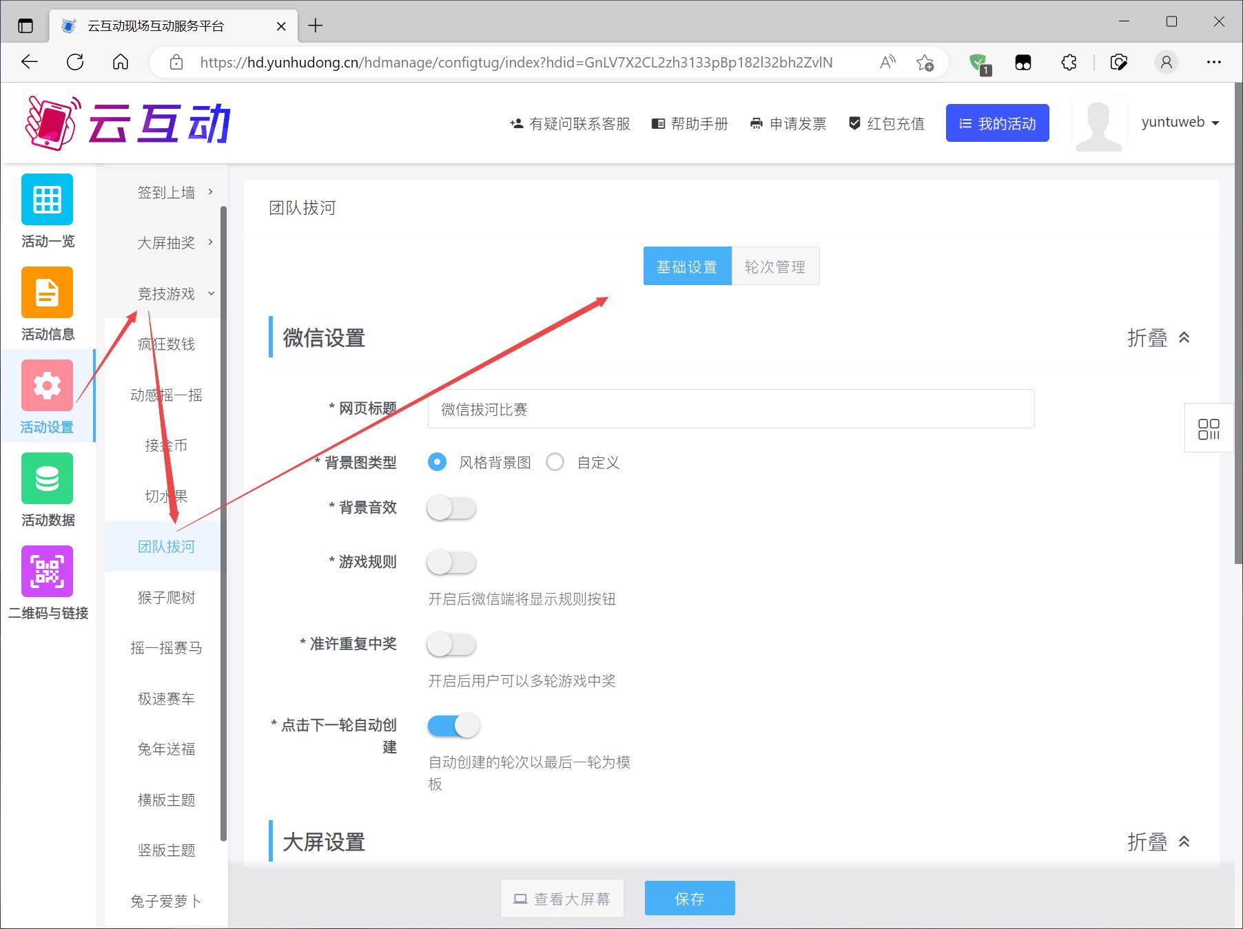 3、也可以在活动设置-竞技游戏-团队拔河中进入拔河游戏的基础设置页面。在基础设置中可以对互动游戏的微信端和大屏幕端样式、背景音乐进行设置,如无特殊需求,使用默认设置即可。