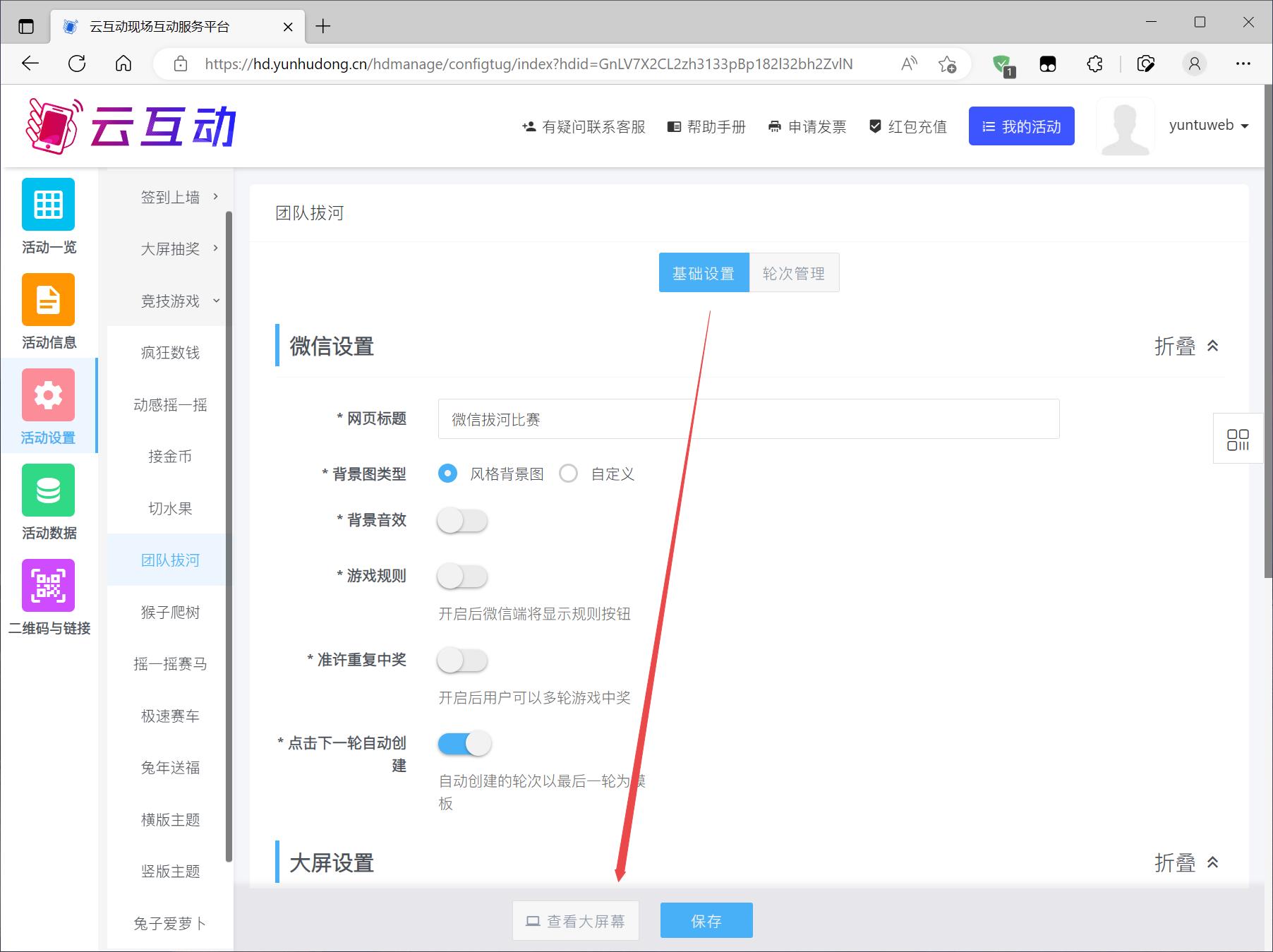 6、添加完轮次后在团队拔河的基础设置底部点击查看大屏幕即可查看效果,并测试活动,测试没问题即可正式购买开通正式活动。