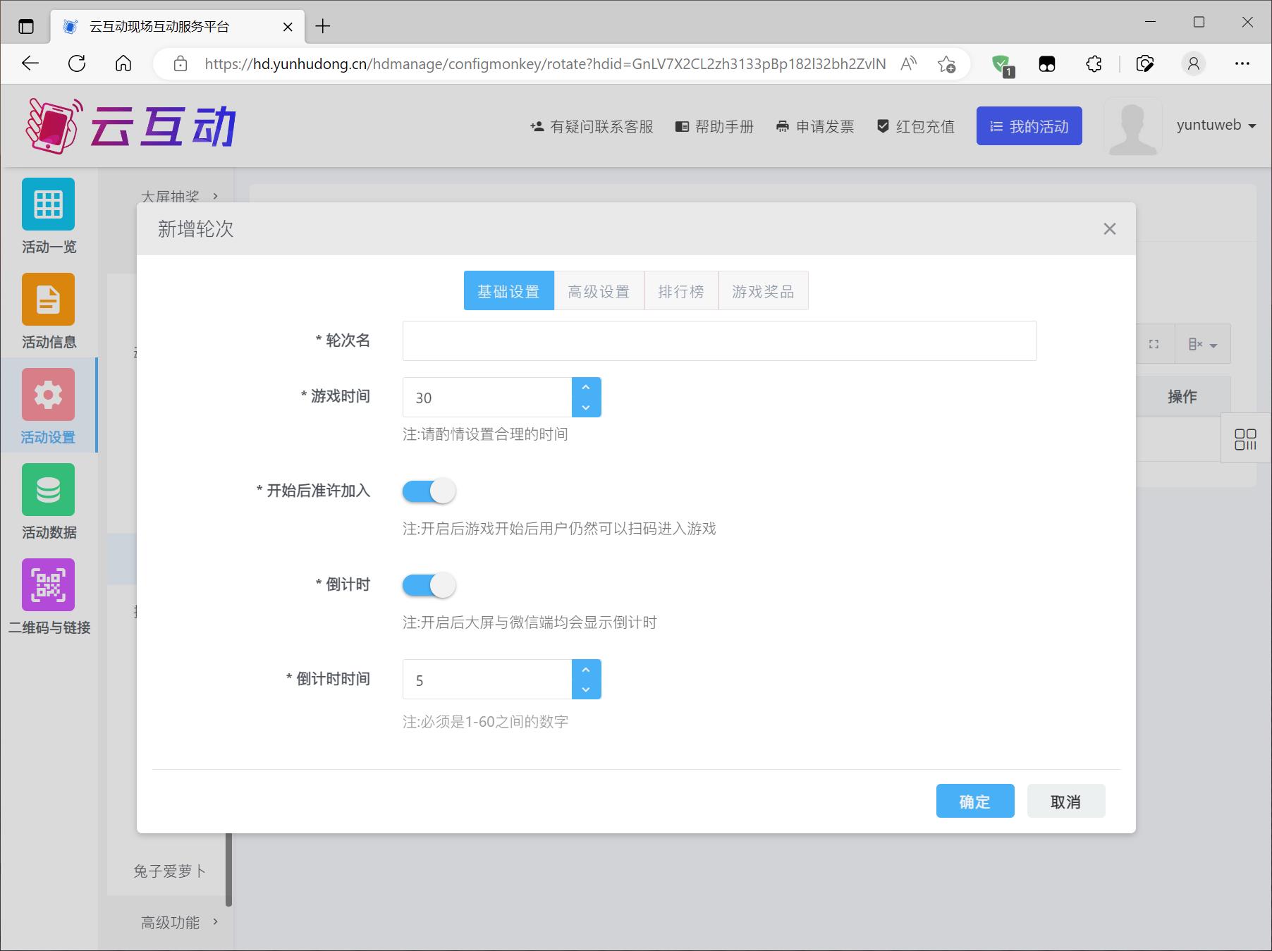 5、在新增轮次中可以对轮次名称、游戏时间、排行榜显示名次以及游戏奖品进行设置,完成设置后点击确定即可保存游戏轮次。