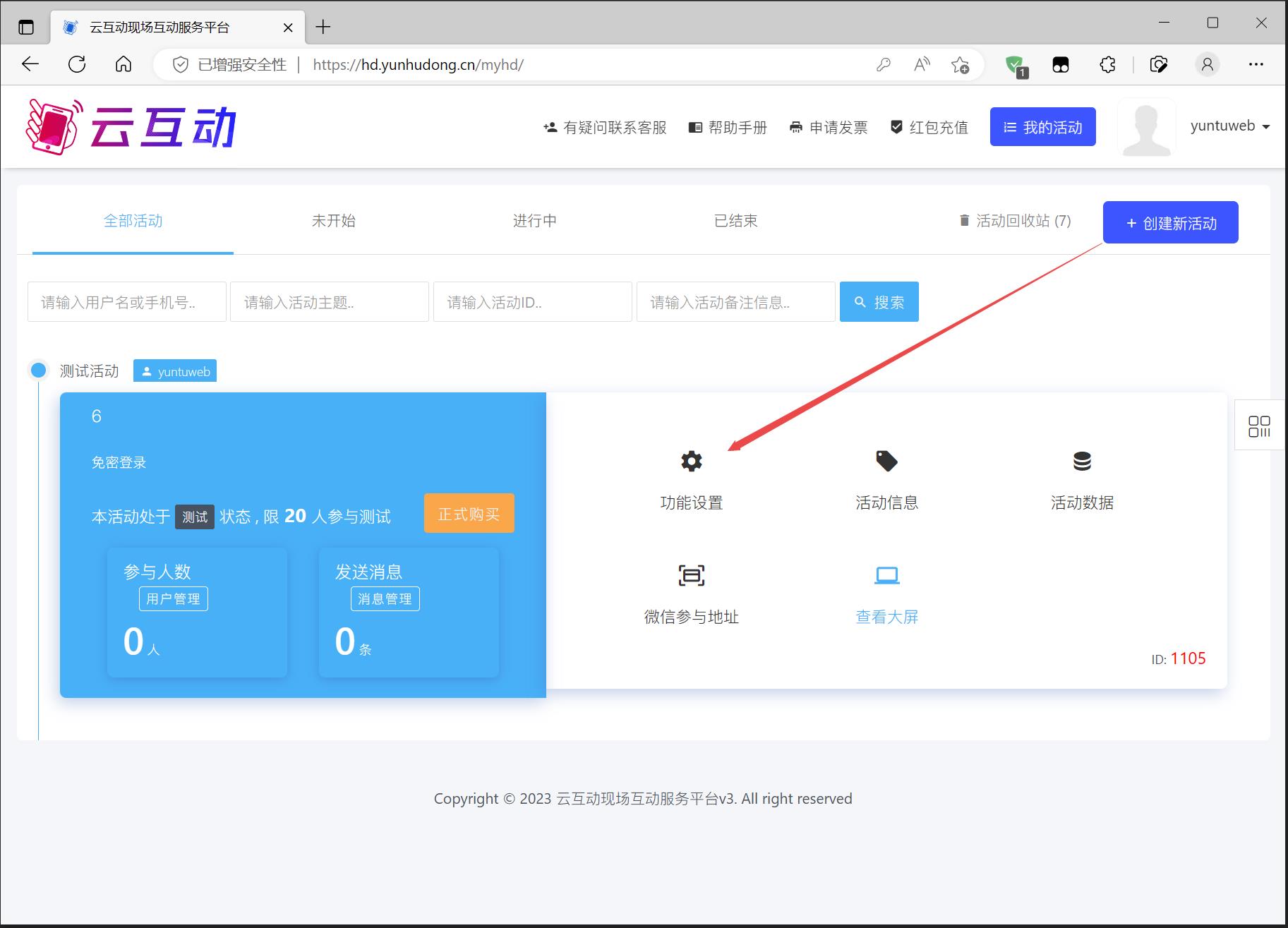1、首先在云互动系统进行账号注册并创建新活动,然后进入功能设置。