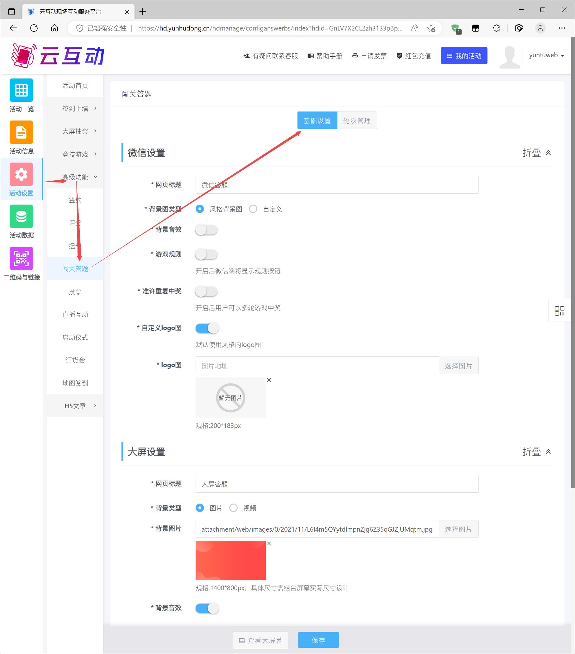 8、添加完轮次后即可在基础设置底部点击查看大屏幕来查看效果预览,并进行活动测试,测试没有问题即可发布正式活动进行使用。
