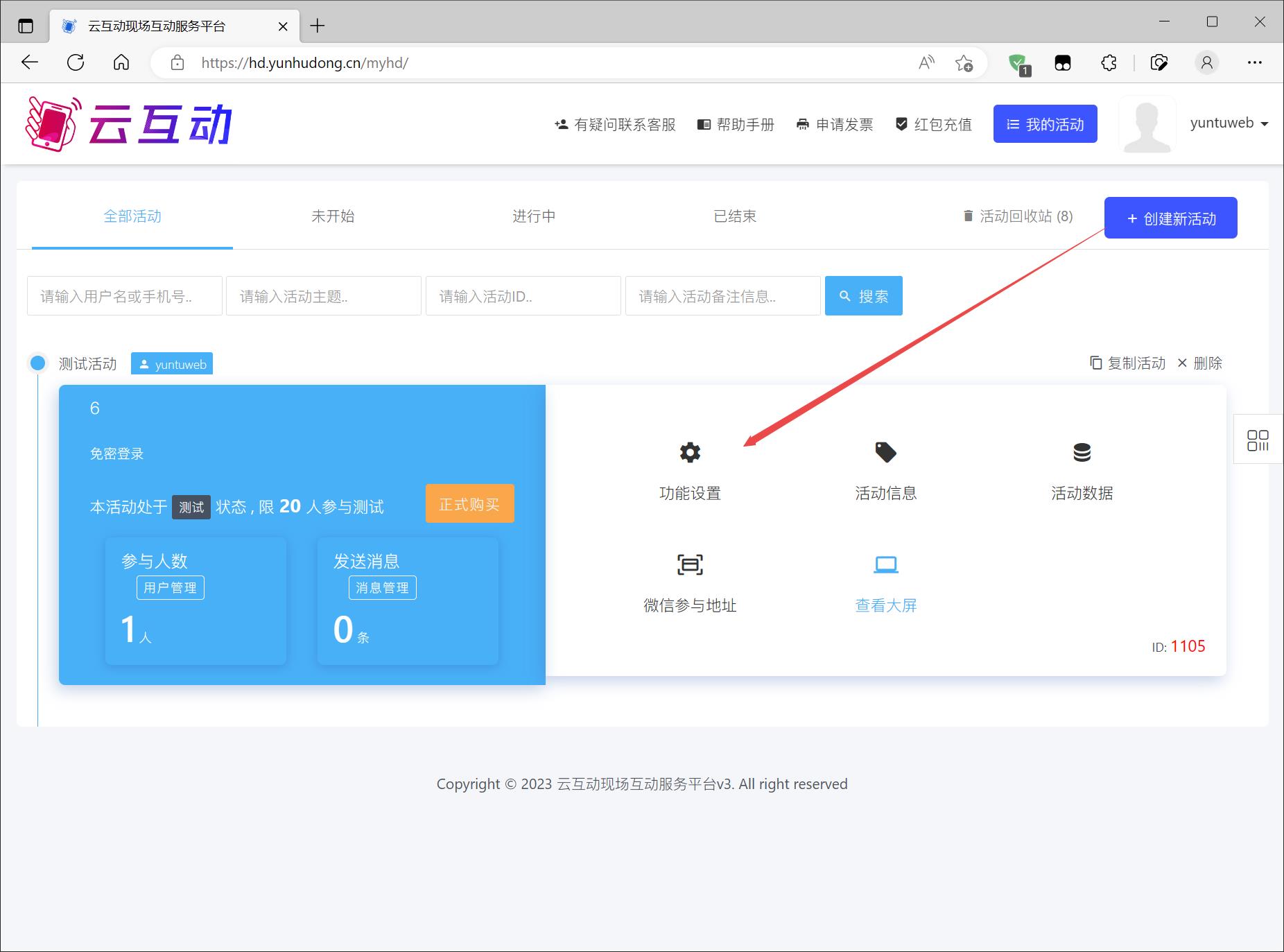1、首先需要在云互动系统注册一个账号,并创建一个新活动,点击功能设置进入活动一览。