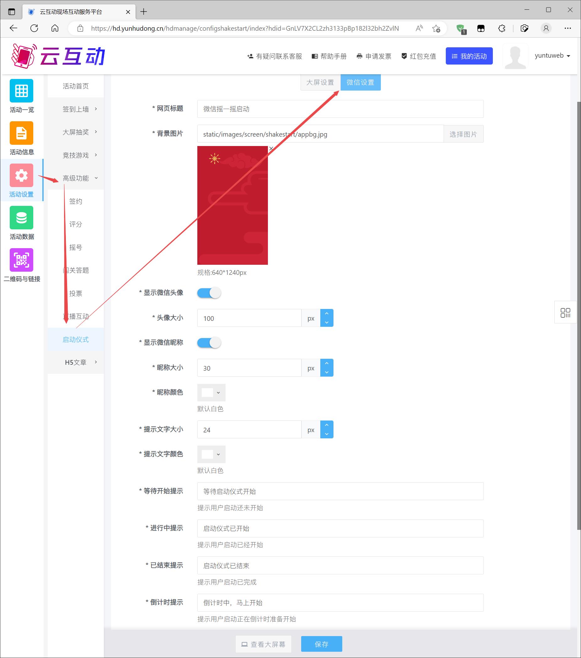 3、在启动仪式的大屏幕设置中可以对大屏幕样式进行设置,分别为启动前、启动中、启动后不同阶段,在启动前设置中可以对摇一摇启动开启之前大屏幕显示的效果进行设定。