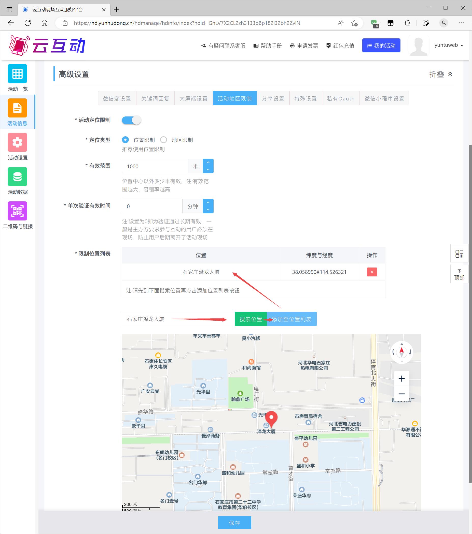 在云互动系统中开启活动定位限制即可进行签到范围的限制,有效防范不在活动现场的人员进行扫码签到。