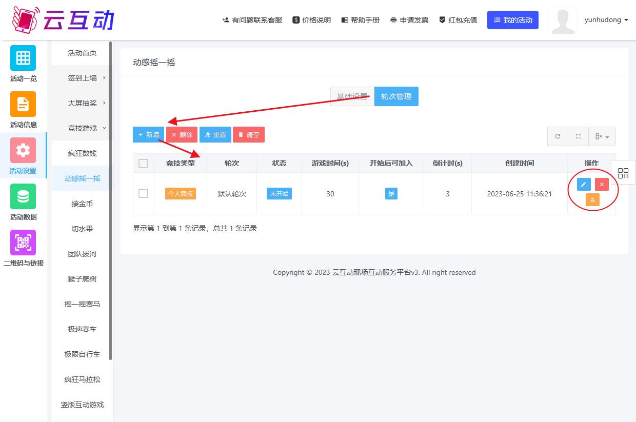 3、在动感摇一摇的轮次管理中点击新增即可增加轮次,云互动系统的竞技游戏都已设置好默认轮次,一般来说不用进行特殊设置可以直接使用,在轮次后面的操作按钮中可以可以对轮次进行编辑或者删除,也可以点击数据按钮查看互动游戏的参与数据。