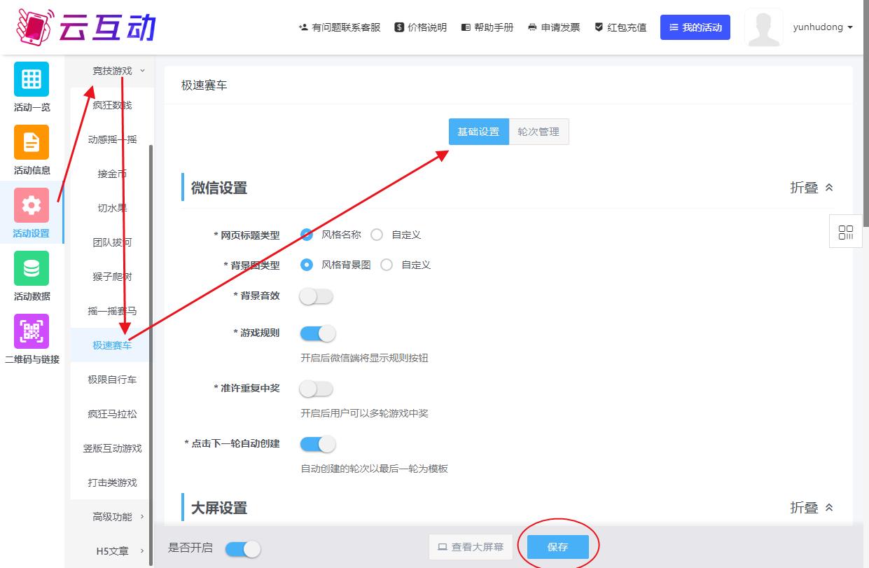 2、在活动设置中找到竞技游戏中的极速赛车,点击即可进入设置页面,在基础设置中可以对极速赛车游戏的大屏幕和微信端样式进行设置,可以自行上传背景音乐和图片进行替换,如果没有特殊需求,使用默认设置即可。