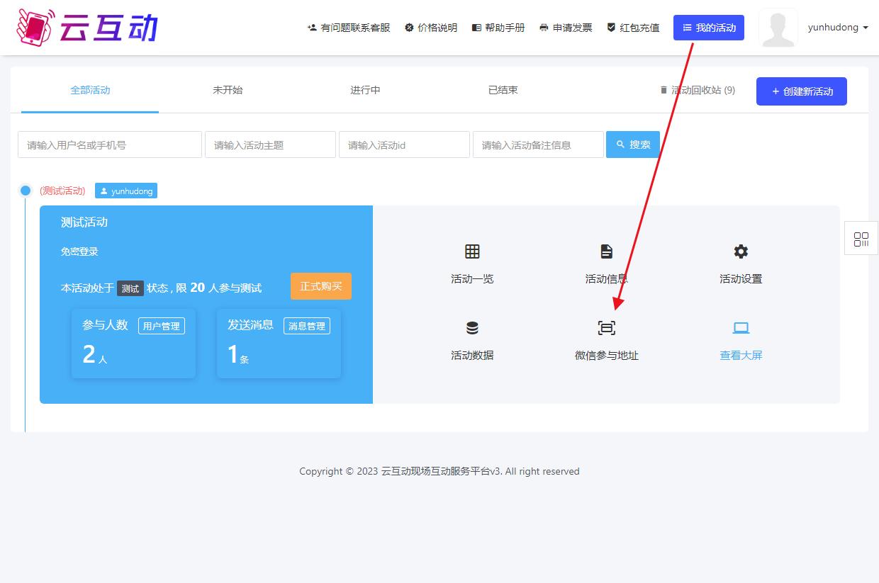 1、在云互动系统的我的活动中找到要使用的活动信息后点击活动设置进入设置页面。