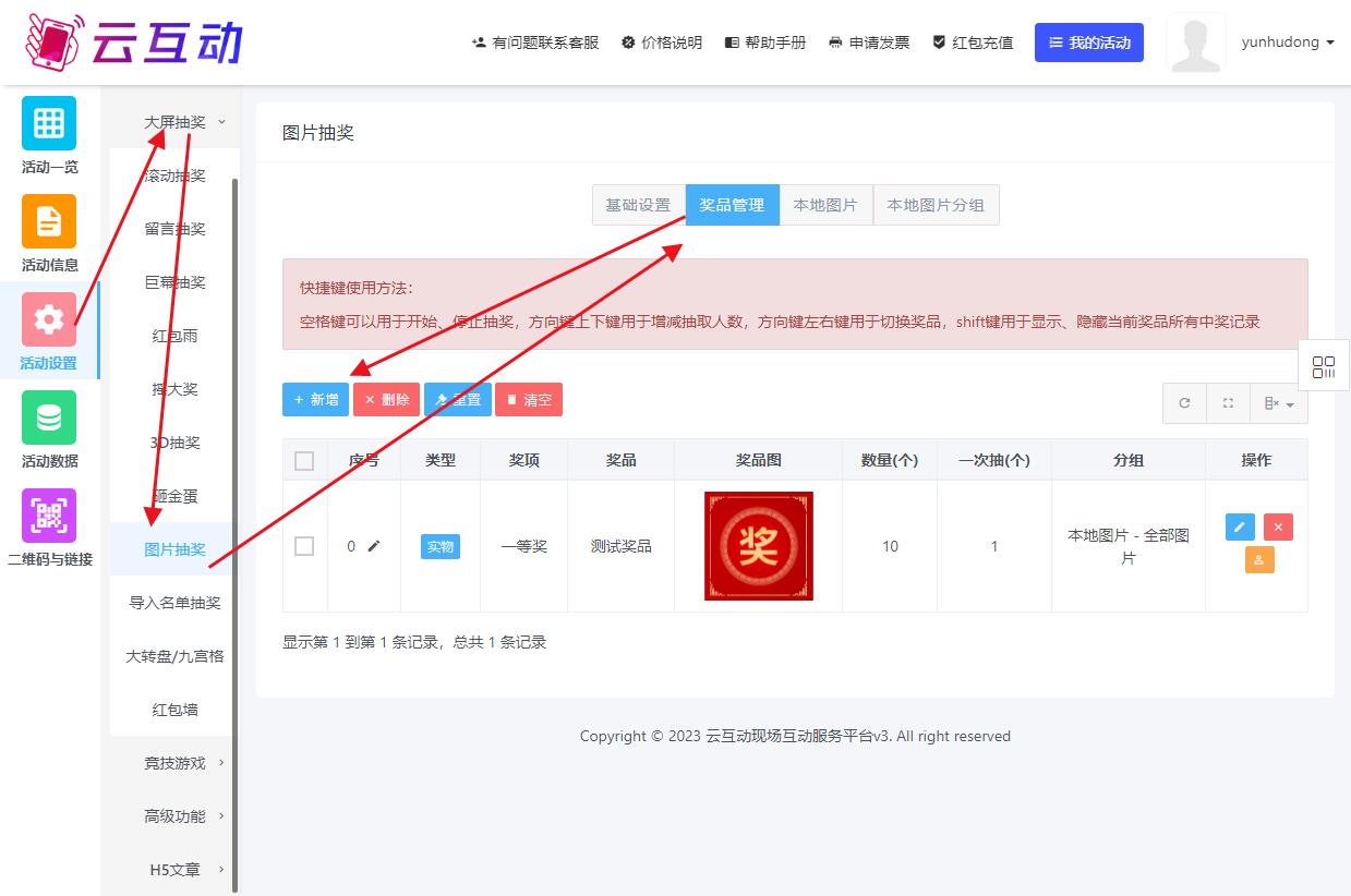 1、首先点击活动设置进入设置页面完成基础设置,在活动设置中找到图片抽奖,并在奖项管理中按需要添加奖品即可,在添加奖品的时候可以选择图片抽奖的图片来源。
