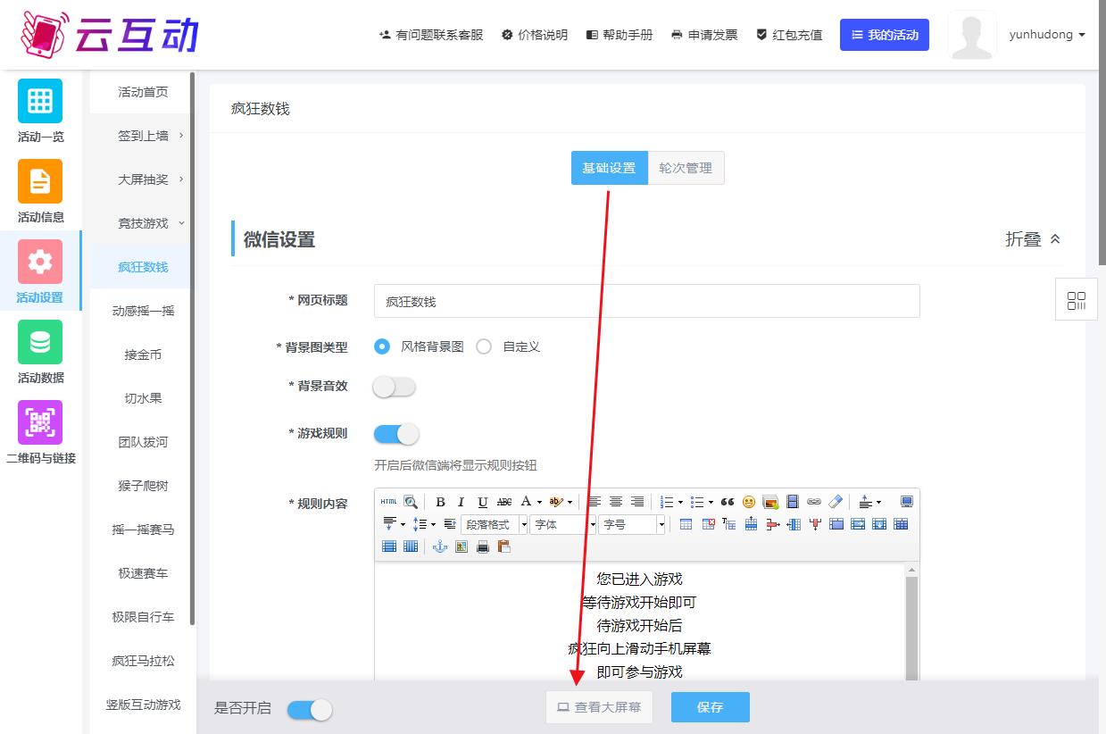 2、在浏览器中打开疯狂数钞票互动游戏页面大屏幕,在云互动系统中有多种方式可以进入互动游戏的大屏幕页面,第一种在疯狂数钱的基础设置底部点击查看大屏幕按钮即可进入疯狂数钞票游戏的大屏幕页面,