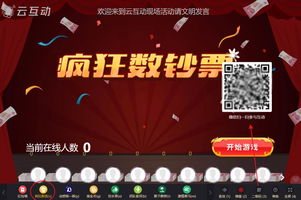 疯狂数钞票游戏设置简单、参与方便、互动效果好,越来越多的活动主办方再使用这个功能进行现场互动了,我们在云互动系统中来简单介绍一下如何使用与参与?