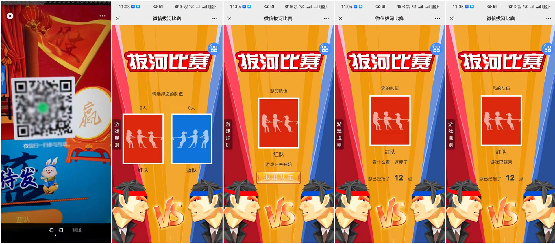 3、现场用户扫码选择队伍参与团队拔河游戏,现场用户使用微信扫一扫功能,扫描大屏幕上的二维码后选择自己要进入的队伍,等待大屏幕开始游戏后摇动手机即可参与,待游戏结束后,会显示助力的点数。