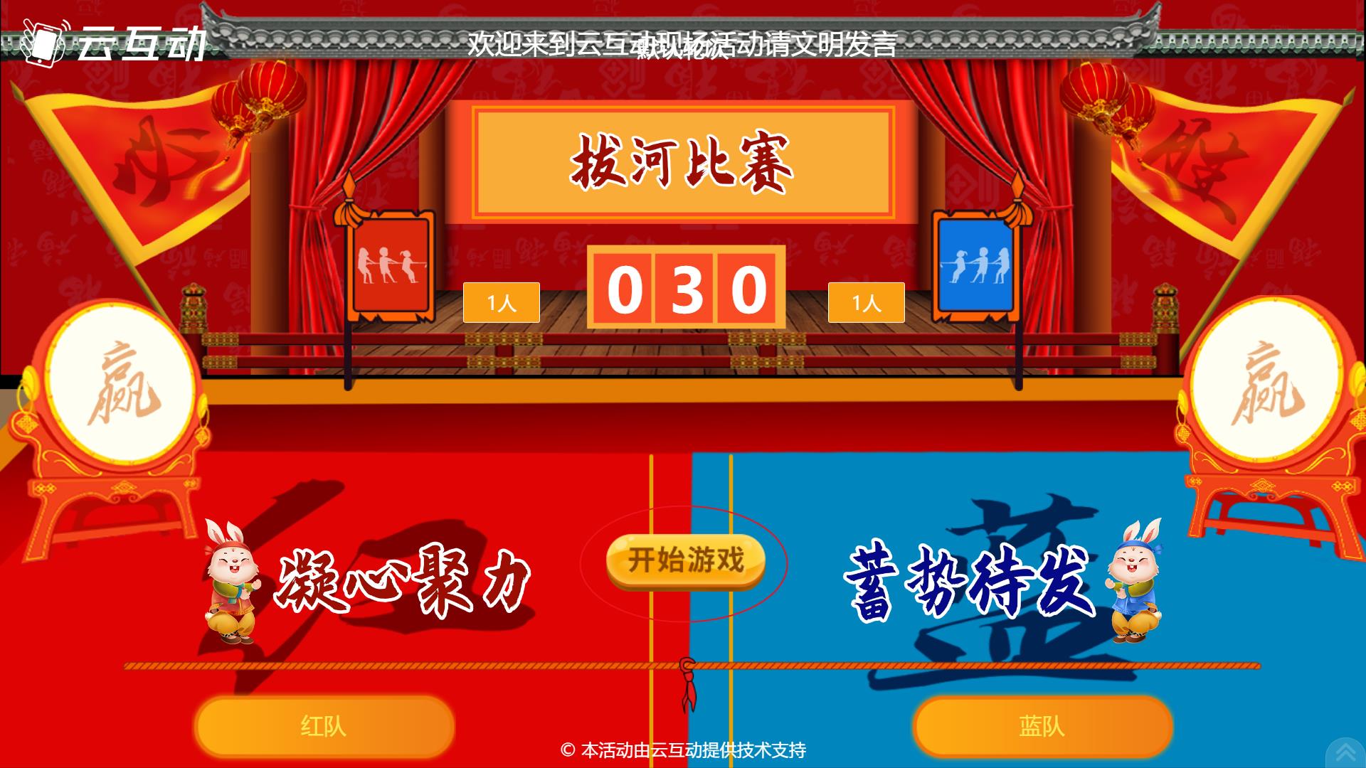 云互动系统的团队拔河游戏具有设置简单、参与方式、互动效果好等优势,短短几步即可使用,我们来介绍一下: