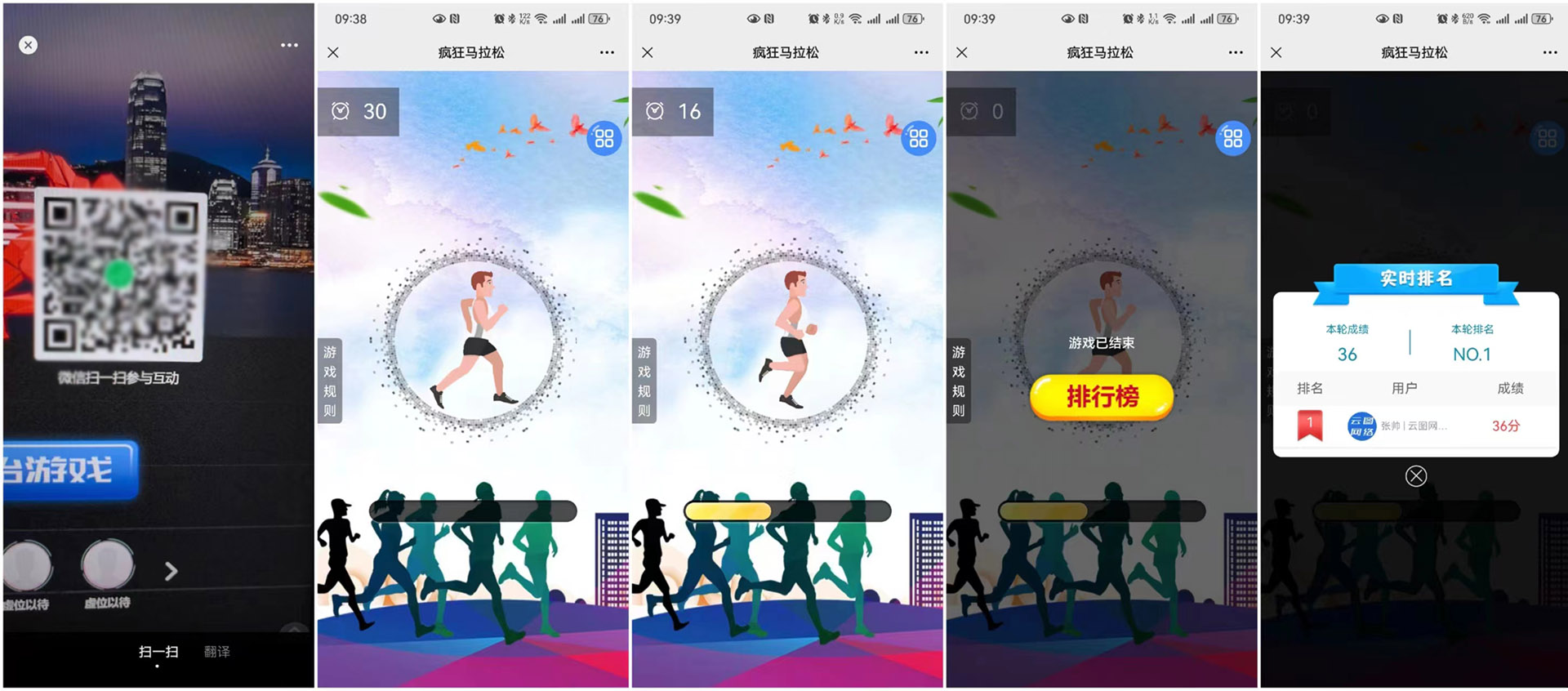 3、现场参与用户使用微信扫码参与摇一摇马拉松跑步互动游戏,大屏幕上投放游戏页面后,现场用户使用微信扫一扫功能扫描大屏幕上的参与二维码即可加入其中,待游戏开始后用力摇动手机即可参与拼手速的马拉松跑步游戏,手机摇动的越快对应的卡通形象跑的就越快,游戏结束后可以通过排行榜查看自己的排名和成绩。