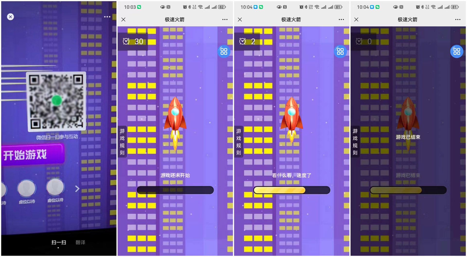 3、现场用户扫码参与极速火箭互动游戏,活动现场的用户使用微信扫一扫功能扫描游戏大屏幕上的二维码即可加入游戏中,待游戏开始后用力摇动手机即可参与,手机摇动的越快,助力值越高火箭上升的也就越快。