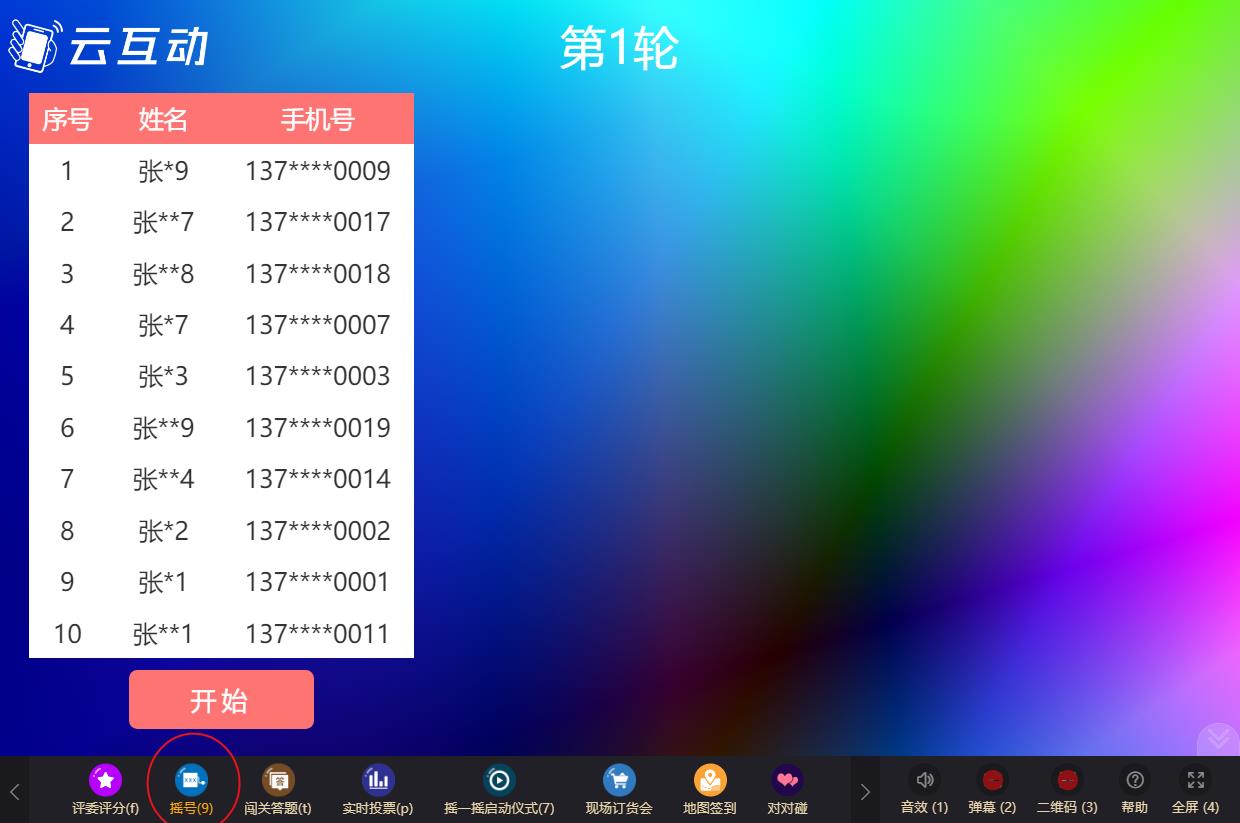 5、在大屏幕上通过摇号系统进行摇号,在大屏幕上投屏摇号页面后,可以使用F11键全屏显示,这样效果比较好,然后摁动空格键或者点击开始按钮,即可开始摇号,再次摁动空格键或者点击停止按钮,即可显示摇号数据,当所有轮次都完成后,会显示最后摇号数据并进行提示。