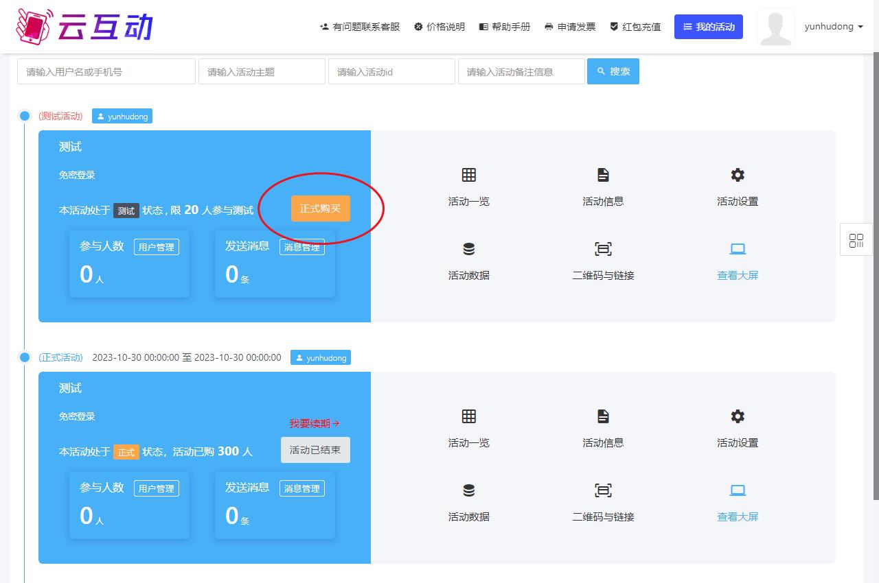 复制过来的新活动,设置依然保留并可重新进行测试,测试没问题后,点击“正式购买”按钮即可选择活动套餐、活动时间然后扫码支付即可。
