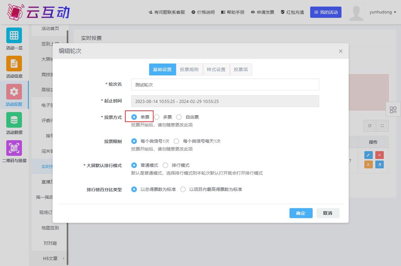 在云互动系统活动设置的高级功能中找到实时投票功能,并进入实时投票的轮次管理,在轮次管理中可以通过新增按钮新增投票轮次,或者点击默认轮次后面的编辑按钮来编辑轮次来进入规则编辑页面。
