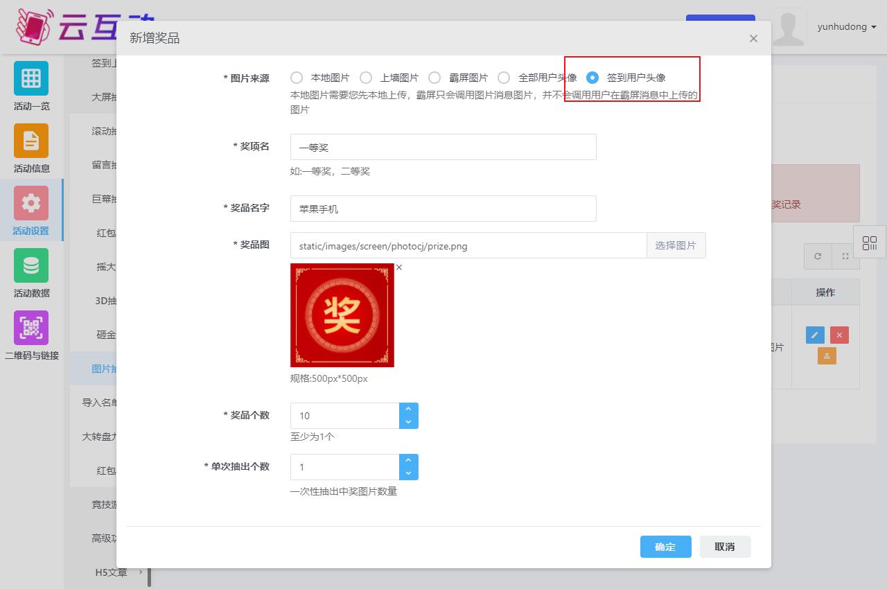 然后使用图片抽奖功能进行奖项的抽取,在图片抽奖功能的“奖品管理”中新增奖品页面选择图片来源为“签到用户头像”即可从签到用户自拍头像中抽取幸运中奖用户。