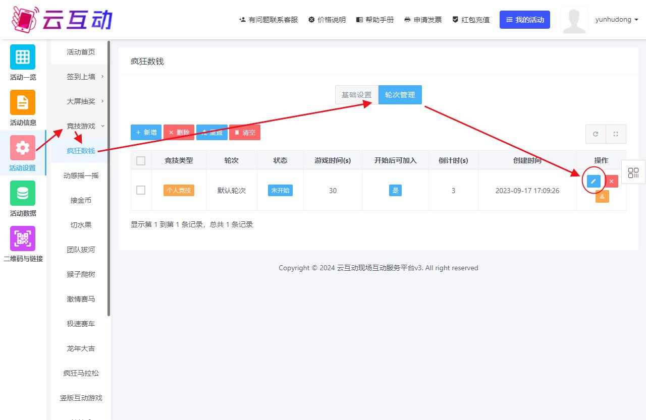 2、在竞技游戏的轮次管理中进入轮次编辑页面:在活动设置中的竞技游戏页面找到要使用的互动功能,我们以“疯狂数钱”为例,在疯狂数钱的轮次管理中点击默认轮次的编辑按钮进入编辑页面。