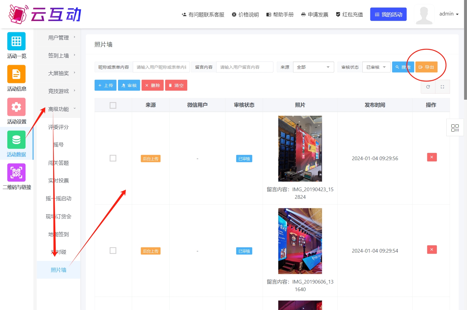 2、进入照片墙查看并导出照片数据:在活动数据中的高级功能中找到并点击“照片墙”菜单后即可进入照片墙的数据查看页面,可以查看用户上传的照片明细,并可以通过点击“导出”按钮将上传明细导出为表格形式进行统计管理备份使用。如需清空用户上传的照片数据,也可以点击删除或者“清空”按钮清空照片数据。