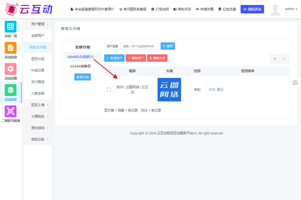 4、用户完成签到验证后自动进入设置好的分组中:当用户扫码填写信息完成验证签到后,在活动数据的自定义分组中可以查看到该用户已经自动分组完成。