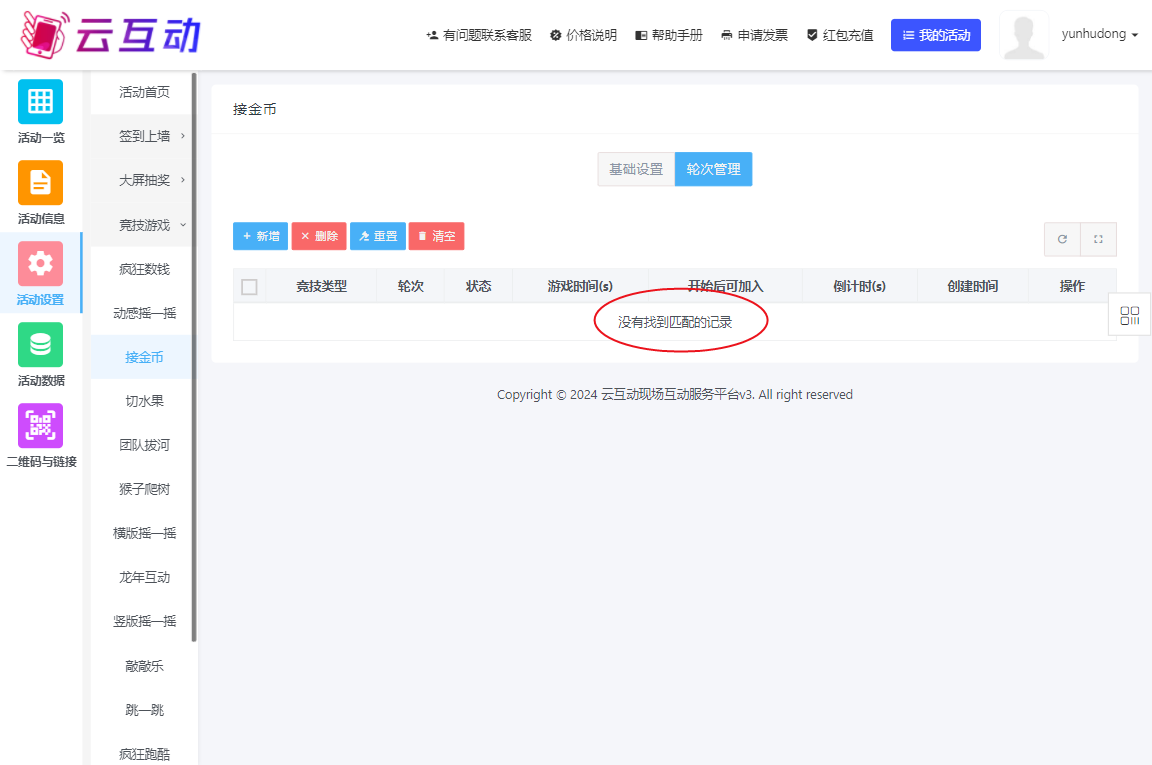 2、请查看活动设置中该互动游戏的轮次管理中的默认轮次是否被手动删除?云互动系统中的竞技游戏均有默认轮次,一般无需特殊设置即可直接使用,如若将默认轮次删除,需要重新创建新轮次。