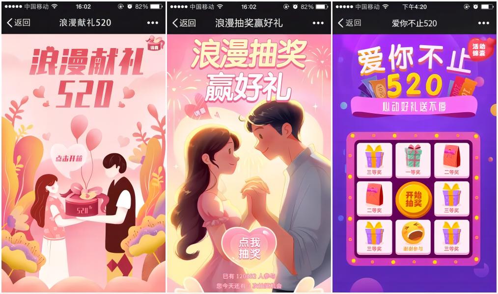该类型的H5小游戏主要有:点击抽奖、浪漫抽奖、九宫格抽奖等。