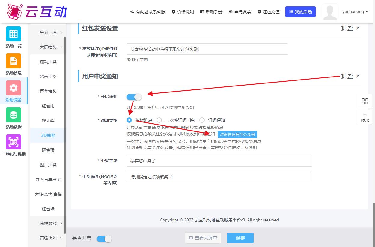 在抽奖功能的基础设置底部展开“用户中奖通知”,并点开“开启通知”选项,即可选择通知类型,共有3种通知类型,其中模板消息必须关注云互动系统公众号才可以接收到中奖通知。