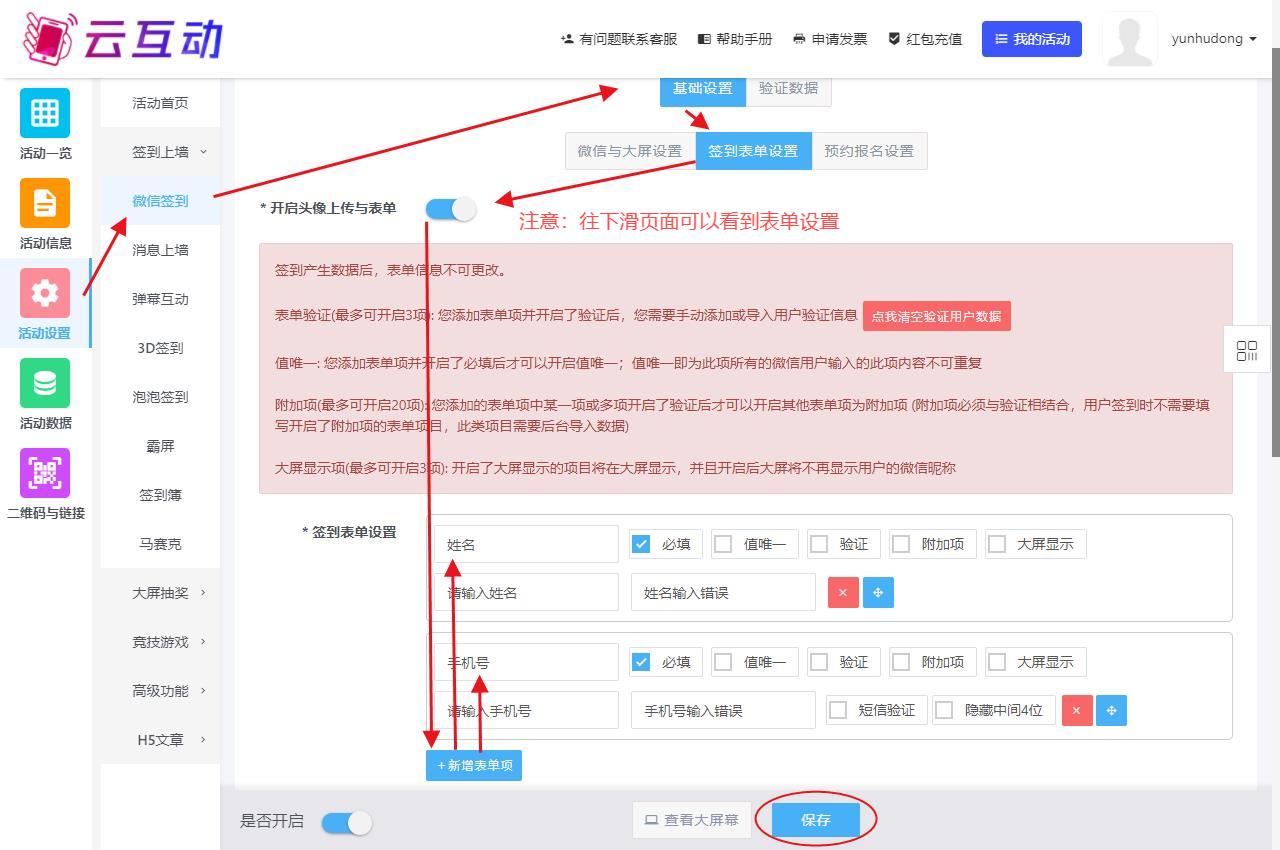 在云互动系统中进入“活动设置”的"签到上墙"菜单中的“微信签到”基础设置选项中的“签到表单设置”页面,