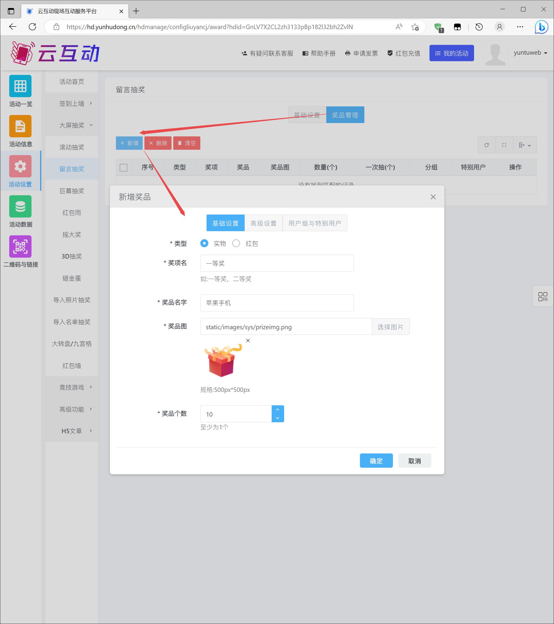 3、在留言抽奖顶部菜单中的奖品管理中点击新增即可增加要抽取的奖品,在新增奖品中的基础设置里可以对奖品的类型、名称、图片、数量进行设置。如果有多个奖项要抽取,重复新增即可。